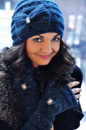It is your time to shine girl when you make and rock this super stylish hat and glove set! Featuring a charming eyelet and garter stitch stripe pattern, and the option of adorning yourself in a big flower or bow, you are sure to shine! The bow set is made with Patons Lace Sequin with 2 strands held together for extra sequin sparkle, with the addition of bling at the center of the bows. The flower set uses Lion Brand’s Amazing for a fabulously chic color changing effect. Fear not the flowers, they are actually knitted using double-pointed needles. Whether you want to go glam or bohemian chic, this pattern is sure to suite your unique style! Enjoy!