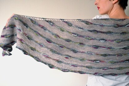 Named for the fantasy novel by Canadian author, Guy Gavriel Kay, Ysabel is a crescent-shaped shawl knit primarily in squishy garter stitch. The shawl's defining feature are the short row shaped stripes that are designed to highlight the gorgeous variegated colors of hand-painted yarns. A photo tutorial is provided on my blog for how to work the short-row sections.