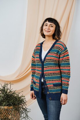 DESIGNED BY Sarah Hatton, this loose-fit, V-necked cardigan has set-in sleeves and handy lined pockets. It’s worked with an all-over stripe pattern that combines four colours and different textures, including moss stitch, slip stitch, and stitches knitted into the row below. Sarah’s chosen yarn - the luxurious, tweedy Arranmore Light from The Fibre Co. - really complements her multi-textured design.