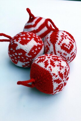 The pattern includes full colour charts for four baubles; striped, reindeer, heart and snowflake.