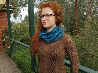 This cowl worked in 8 ply / DK yarn is in a thick and thin rib pattern with borders of brocade squares. It’s a fun and easy knit.