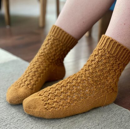 Why use only lace or fingering weight yarns for lace patterns? In my opinion, lace patterns look even better when worked with thicker yarns, for example in DK weight. Yvonne is one outcome of my explorations with thicker yarn and lace pattern combinations. These airy socks are knitted from the cuff down to the toe and suitable for warmer weather