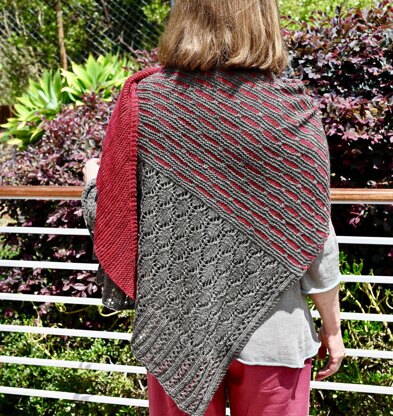 This triangular shawl starts with one color at the widest part with two lace patterns and is decreased to taper at the peak. Two-color slip-stitch pattern combined with garter stripes follows the lace and later it transitions to a garter stitch in a single contrasting color. Written instructions will take you through all the decreases. This project is fun to knit and change of patterns keeps you engaged. The last portion of garter stitch is pure relaxation. When shawl is worn, the look combines all textures and colors and makes it irresistible.