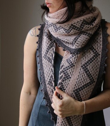 Playful zigzags run the length of this elongated semi-circular shawl, done in an easy-to-knit mosaic pattern that looks much more complicated than it is.