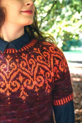 Zaviona is a top-down seamless yoke sweater that is knit in the round. There is a corrugated ribbed neckline followed by short rows at the back of the neck for a comfortable fit. The yoke features stranded colourwork that has a whimsical flowing curlicue motif. There is optional waist and hip shaping to add feminine shape, and the hem is finished off with ribbing. The pattern offers alternatives for both mid length and long sleeves. Both versions are finished off with corrugated ribbing. The motif was inspired by Art Nouveau Metalwork in Poland.