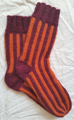 Knitted in worsted weight wool, these heavy socks will fit best with boots or worn as slippers. It features a gathered toe and an Afterthought Heel