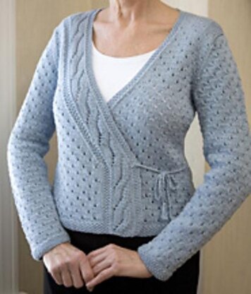 A classic cardigan wrap to make you feel calm and collected. The faux cable detail on the right front curves its way to the shoulder and then just glides straight down the back. The overall eyelet pattern keeps you cool and elegant. Twisted cord ties inside and out provide a custom fit. It's equally elegant as a vest!