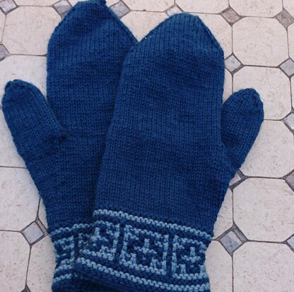 Zibannety features a 2 colour mosaic band at the cuff with a stocking stitch thumb gusset and hand.