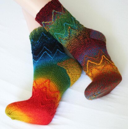Standardsocken mit einem kleinen Gimmick, den Zickzacklinien, die mit der Häkelnadel aufgehäkelt werden. Anfängerfreundlich, wenn du schon mal Socken gestrickt hast und Luft- und Kettmaschen häkeln kannst. Diese Anleitung habe ich speziell für die vielen Farbverlaufsgarne oder Garne mit groÃen Streifen geschrieben. Auf diesen Ga