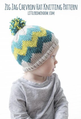 The Zig Zag Chevron Hat Knitting Pattern is fun and bold and bright and the perfect modern baby hat for your little one! This zig zag hat pattern looks cute in shades of blue and green or would be adorable in pinks and reds or any other color combination. This baby chevron hat knitting pattern also includes instructions to top your hat with a fun multicolored pom pom! This zig zag chevron hat knitting pattern is knit in the round and requires basic knowledge of stranded or fair isle knitting.