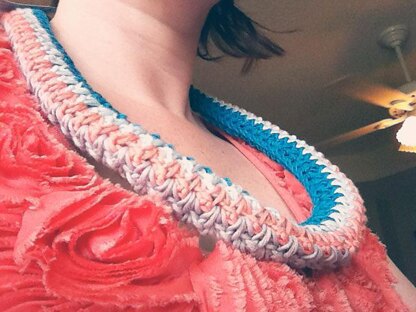 The tube necklace crocheted from this pattern has a great zig-zag pattern for a statement piece of jewelry. Made in 100% Egyptian cotton, it makes for a beautiful, durable necklace with a nice sheen. The skills required are foundation single crochet, double crochet decrease, and whip stitch seaming. The pattern is very customizable, so it can easily be made to perfectly suit your needs.