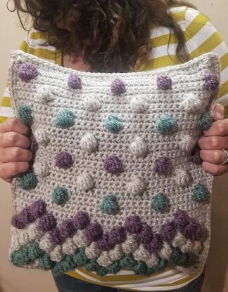 The idea for this pillow came about when I was looking for something fun and functional for my son’s nursery. The bobbles in different colors add a touch of whimsy to the pattern. The dotted bobble section is a bit more modern.
