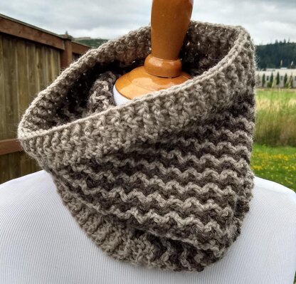 The finished cowl measures approximately 10" tall and 12" across (24" around). It is easily modified for size by changing stitch count in multiples of 4 stitches and adding/removing rows for height.