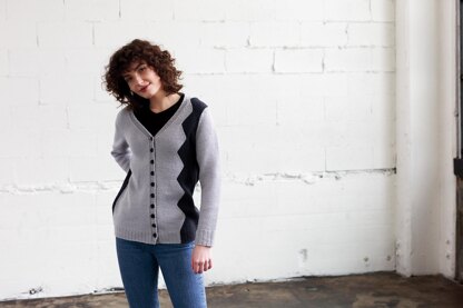 Colour wraps around the left front from the back in this two-tone cardigan, creating a dramatic effect without overstatement. The perfectly executed zigzag front—created through shaping, not charting—is an easy and satisfyingly neat introduction to intarsia colourwork.