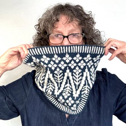 Zimbrel - A bold and eye-catching two-color stranded knit cowl, perfect for adding a striking touch to your outerwear. Worked in the round, it features corrugated ribbing at the edges, framing a central zigzag flower motif flanked by a delicate floral design. Generously sized, it can be worn draped over the head, scrunched up for extra warmth, or folded in half for a sleek look. Options are included for a smaller cowl or an all-over floral pattern, giving you flexibility to customize your perfect piece.