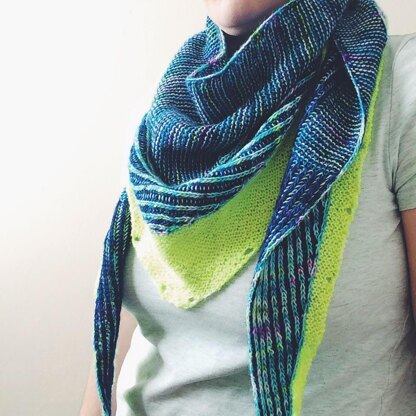 This long triangle shawl is knit from one corner to the other using simple brioche increases and decreases. Interest and texture are added to the fabric with two-color garter steps, which are staggered as the shawl takes shape. The accent border is added by picking up stitches along the shawl edge, then finished off with short row shaping and an eyelet bind off.