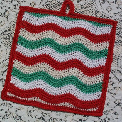 This is an original pattern for a colourful double thickness potholder with a zingy ripple pattern on the front. The reverse is plain red, and both thicknesses are joined by a double row of crochet in red.