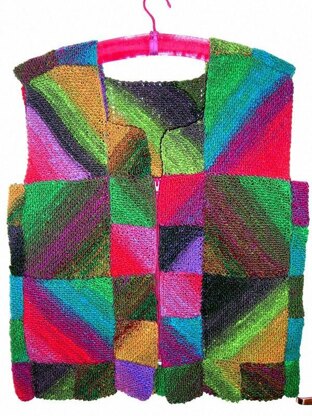 From a collection of 'easy knit' patterns created entirely from a combination of simple knitted squares, this useful waistcoat/gilet slips on easily for that extra layer when needed. Can be left edge to edge or finished with the zip up front.