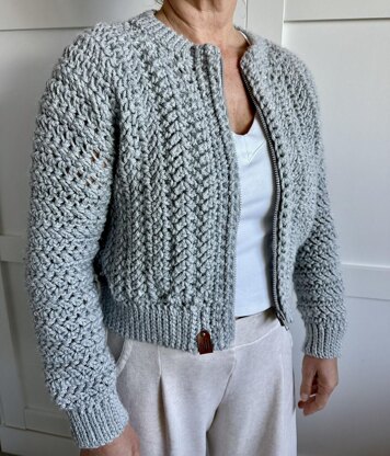 Be stylish with this cozy bomber sweater. The herringbone double crochet stitch forms elegant vertical stripes. Perfect for layering, this piece will become a staple in your wardrobe. Match it with my Downhill Beanie (sold separately) for a coordinated look.