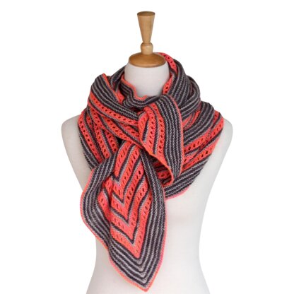 Starting with a provisional cast on, you can see the depth of the color contrasts beginning almost immediately. Garter stitch rows and simple eyelets add to the textural story, while the rhythm of the knitting keeps progress in motion. The Zircon Wrap is part of the Strata Collection, which features five bold garter stitch shawls.