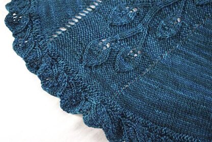 The blanket is knit in the round from the center out. The majority of the blanket is knit in stockinette embellished with climbing vines and leaves at the edges. Both Charts and written instructions are provided. It is finished with a knit-on edging. A small edge seam is sewn to complete the blanket.