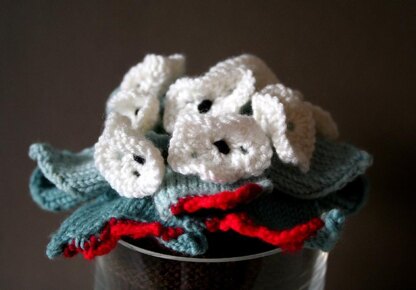 Simply pop this lovely into a plant pot about 3-4 inches high for an unforgetable gift or conversation piece. Alternatively, if you want to knit a cute posy, simply omit the bleeding leaf stumps and chose far more cheerful colors!