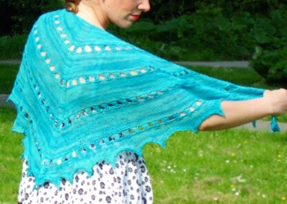 Sometimes when I think of summer I get this picture of a turquoise sea, rolling gently over a white sandy beach. Imagine the heat of the sun and the cool breeze carrying the scent of salt. This image of summer bliss is what inspired me to design this shawl, which is just right to throw on when the sun goes down and the air becomes a tad chilly. Knitted from the top down, with only 100g of fingering weight yarn, it’s the perfect summer project.