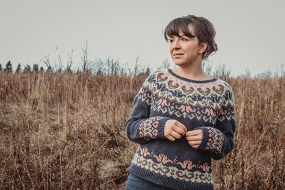 Zyma Sweater is a round yoke colorwork pullover. It’s knitted from the top down, so you can try it on as you knit, to achieve the perfect fit. It’s adorned with fun, matching motifs - on the yoke, the body and sleeves.