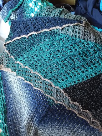 The colours remind me of Australian gum trees regenerating from bushfires and gravel roads. Wrap made using the left over yarn from Ripleys Sister shawl, and another cake of Its A Wrap Rainbow, so my shawl will be bigger. Edged with the sand colour from the Couture cake, with some left over, but when blocked this will be a long shawl, so I didn't add more pattern repeats.