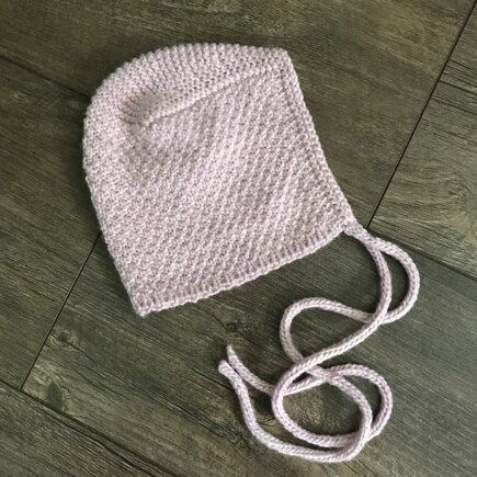 Notes: Attached 3 stitch I-cord by keeping the stitches live after knitting for 16". I picked up 3 stitches on the corner of the bonnet and did a 3 needle bind-off to attach the two pieces. In the past, weaving in just one end in order to attach to the bonnet always stretched out over time and wasn't very secure.