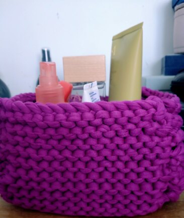 Notes: Approx 14 stitches across, 20 rows deep and 16 rows high. Knitted as a "net of a cube" minus the top side. See, maths is everywhere!