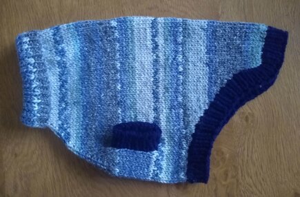 Notes: Chest 50cm; Length 40cm I knitted in stocking stitch and shortened the length to fit the dog
