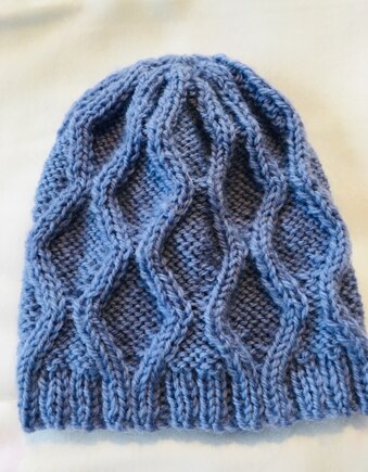 I decided this hat would be nice to knit due to it's pretty cable design. The wool I used seemed more purple prior to knitting it up, but in certain lights it looks blue. We don't know yet whether baby is a boy or a girl. I think it would be nice to decorate the hat with knitted or cloth flowers, if I need to make the hat more suitable for a girl.