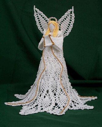 This elegant crochet pineapple angel is worked up with pineapple panels that overlap at the top and are slightly twisted around to form the skirt. Non-traditional pineapple wings add strength while her golden crochet hair lends beauty and peace. Holding a scroll, she's sure to win your heart.