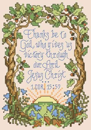 Designed by: Sandy Orton. \nThis small depiction of scripture 1 Corinthians 15:57 “Thanks be to God, who gives us victory through our Lord Jesus Christ” is lovingly portrayed with mighty oak trees encircling the rising sun. This design by Sandy Orton is sure to inspire.