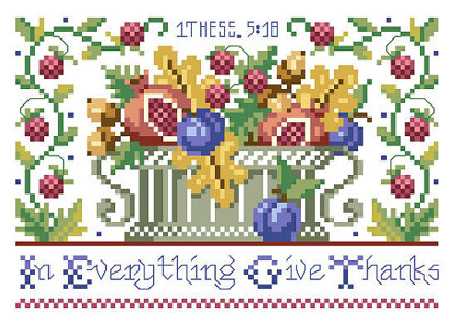 By Sandy Orton. A great companion piece to Jeremiah 33:11, #1503, this classic Americana sampler style design says it all: In Everything Give Thanks. The bountiful harvest represented in the design captures the spirit of the verse.