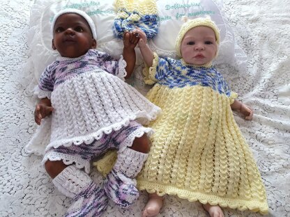 Instructions for a simple, but pretty little set which can be either an angel top with shorts or a longer length dress. There is a headband and little bootees made to look like Mary Jane shoes with socks to match. The skirt area is knitted in one piece to the armholes so there is only one seam to sew at the back. It has short, raglan sleeves.
