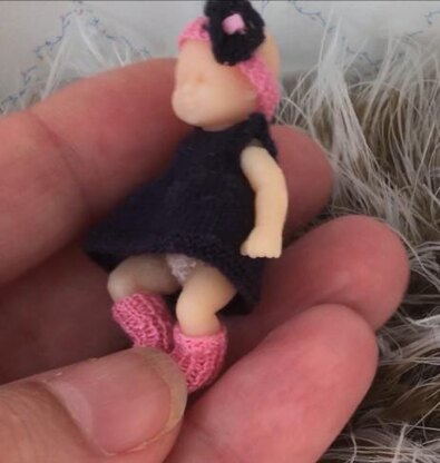 This pattern uses size 22 miniature knitting needles (UK) and embroidery thread in pink and navy, and mainly uses stocking stitch, 1x1 rib and garter stitch. The dress closes at rear with 2 tiny buttons or beads and can be removed for dressing. The pants are cream.