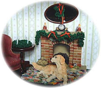 Crochet pattern to make a 1/12th scale Christmas fireplace garland, swag (shown on mirror over fireplace) and Advent wreath (shown on table to left of fireplace) for a dolls house.