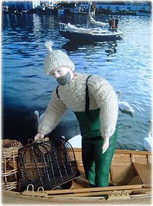 Approximate finished sizes: Gansey – 5 cm/2-inches neck to hem, sleeve length 4 cm/1½-inches. Sea boot stockings – leg length (with rib turned down) 4 cm/1½-inches, foot length 2 cm/¾-inch. Hat - 2 cm/¾-inch top to brim.
