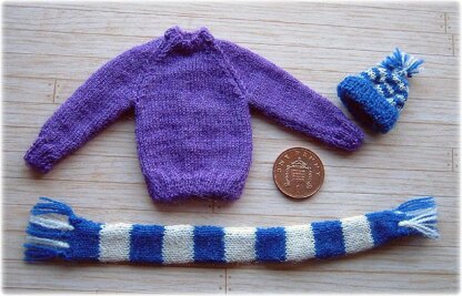 Materials required: size 19 (1.00 mm/US size 5/0) knitting needles, plus: Plain bobble hat – 28 yards/25 metres 1-ply yarn. Striped bobble hat – 14 yards/12.5 metres 1-ply yarn in both main and contrasting colours. Scarf - 28 yards/25 metres 1-ply yarn in both main and contrasting colours. Jumper - 56 yards/50 metres 1-ply yarn, 3 stitch holders or safety pins.