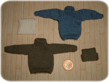 Finished sizes: Jersey or Guernsey – 6 cm/2½-inches neck to hem, 4 cm/1½-inches across chest, sleeve length 6 cm/2½-inches shoulder to wrist. Fatigue cap/shoulder scarf – 2.5 cm/1-inch wide, 7.5 cm/3-inches long before folding Body Belt - 3 cm/1¼-inches wide (as this is ribbed it will stretch), 3 cm/1¼-inches high.