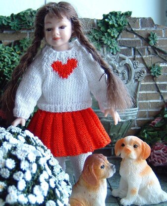 Materials required: Jumper - size 22 (0.75 mm/US size 6/0) knitting needles, ¼ ball No 80 crochet cotton in main colour, small amount No 80 crochet cotton in contrast colour for heart motif, stitch holders. (Note: This jumper can be worked in one colour only by omitting heart motif from front.) Skirt - size 22 (0.75 mm/US size 6/0) knitting needles, ¼ ball No 80 crochet cotton in contrast colour.