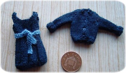 Finished sizes (approximate): Gymslip – 2½-inches/6 cm long, 1-inch/2.5 cm at chest. Cardigan – 1½-inches/4 cm long, 1-inch/2.5 cm at chest. Sash - ⅛-inch/2.5 mm wide, 4-inches/10 cm long or made to length as required.
