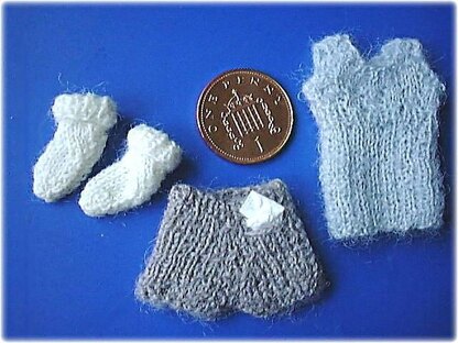 Finished sizes (approximate): Vest – 1½-inches/4 cm long, 1¼-inch/3 cm at chest. Gym knickers – 1-inch/2.5 cm cm high, 1-inch/2.5 cm at waist. Socks - ¼-inch/1.25 mm wide, ¾-inch/2 cm long.