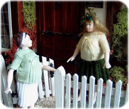 Materials required: Skirt - One pair size 19 (1 mm/US size 5/0) knitting needles, 50 metres/56 yards 1-ply wool or 2 skeins DMC Broder Spécial No 25. Note: This skirt is designed to go under a jumper and therefore is only pleated in the part that shows beneath the jumper. The remainder of the skirt is ribbed to make it fit close to the dolls body and have less bulk. Yellow jumper - One pair size 19 (1 mm/US size 5/0) knitting needles, 50 metres/56 yards 1-ply wool or 2 skeins DMC Broder Spécial No 25., stitch holders, small length of narrow ribbon for bow. Green Jumper - Size 22 (0.75 mm/US size 6/0) knitting needles, stitch holders, approx. ½ x 5 g ball No. 80 crochet cotton or tatting thread No. 70, small button or bead for neck, small length of narrow ribbon for bow.
