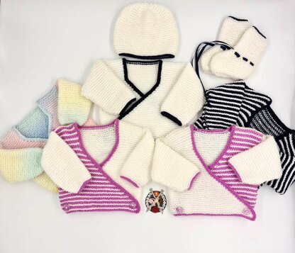 Instructions for a simple, traditional, garter stitch crossover cardigan. The pattern is easy to follow and it has been written for both the stripe pattern and the plain pattern with contrast edging. This pattern is so versatile, you can mix and match the plain pattern with the stripe pattern within each piece knitted so you can make up your own individual style. The pattern ranges from premature size to 3 months, and the cardigan has a matching beanie hat and long leg length bootees.