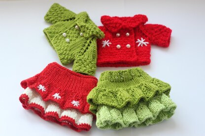 The set consists of a lovely cardigan and skirt. The cardigan is knitted in a single piece from the top-down. Has 4 buttons. An ideal gift for the little dolls´ owners! The rock with 2 ruffles is also seamless.
