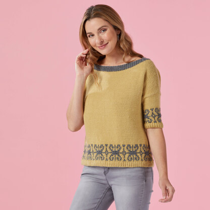 Valley Yarns Bryce Canyon is a striking women’s jumper featuring a mosaic border above the hem and the cuffs knit in Ashfield. The tee top is perfect for the day at the office and then a night out on the town. Bryce Canyon is knit in the round from the bottom up to the underarms. The elbow-length sleeves are worked from the armhole edge in the round to the cuffs. Valley Yarns Ashfield is a silky soft, and smooth blend of fine Merino wool and bamboo viscose that offers beautiful drape and sheen. The mosaic pattern is charted and written out.