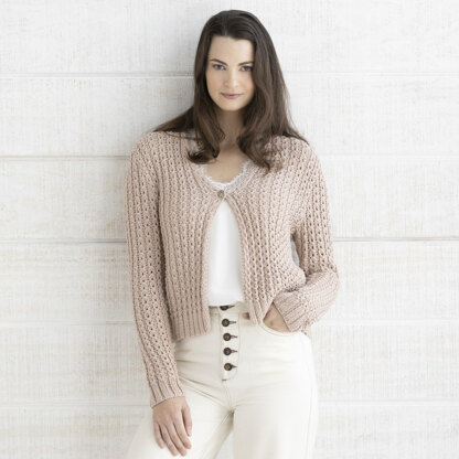 Valley Yarns Caladium is a gorgeous women’s cardigan that showcases a deep v-neck with a single-button closure and an all-over lace pattern knit in Toby. The jumper is the perfect layering piece over a dress or a tank over a pair of jeans. Caladium is knit flat in pieces from the bottom up and then seamed. Toby by Valley Yarns is a smooth and sophisticated yarn. This yarn has a beautiful blend of Mako cotton, Mulberry silk, and cashmere, making it lovely to touch. The lace pattern is charted and written out.